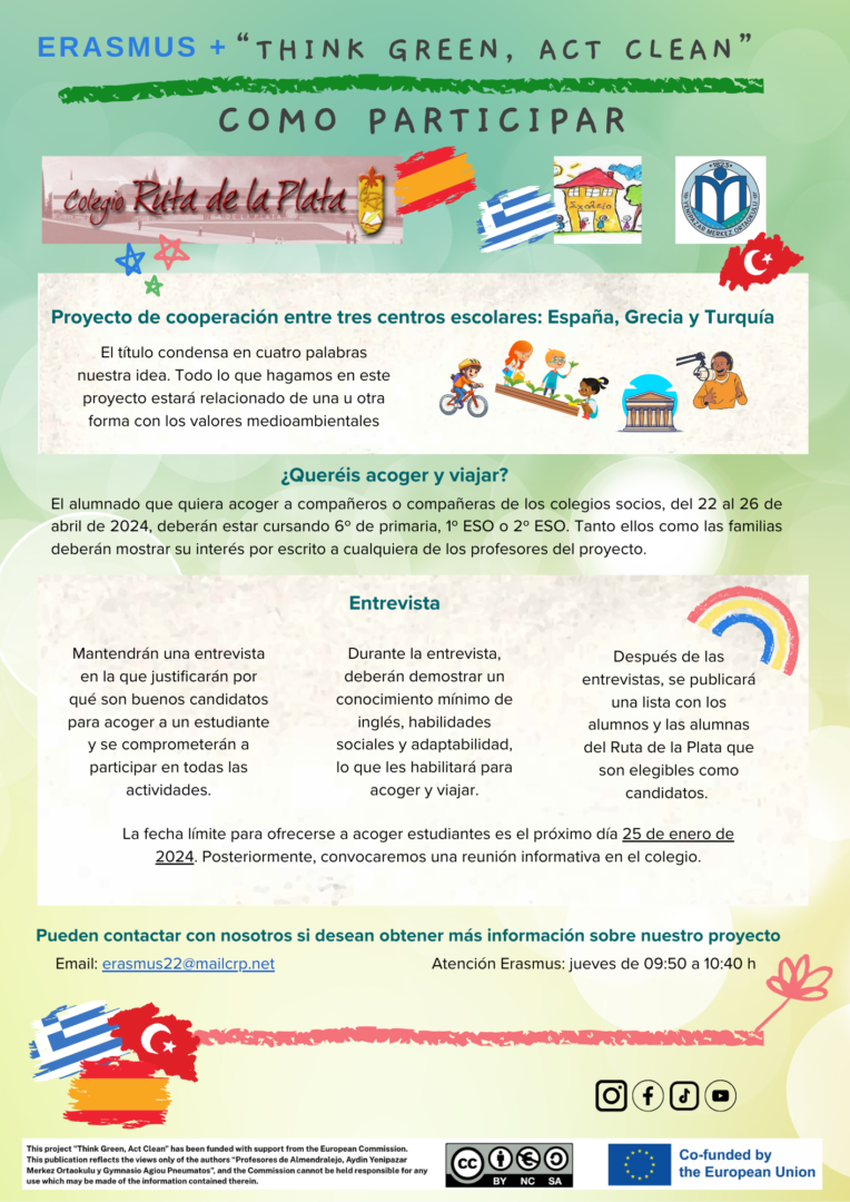 Os mostramos el cartel que anuncia el inicio de plazo para inscribirse como alumno interesado, en el proyecto de cooperación entre tres colegios de Europa, «Think Green, Act Clean».